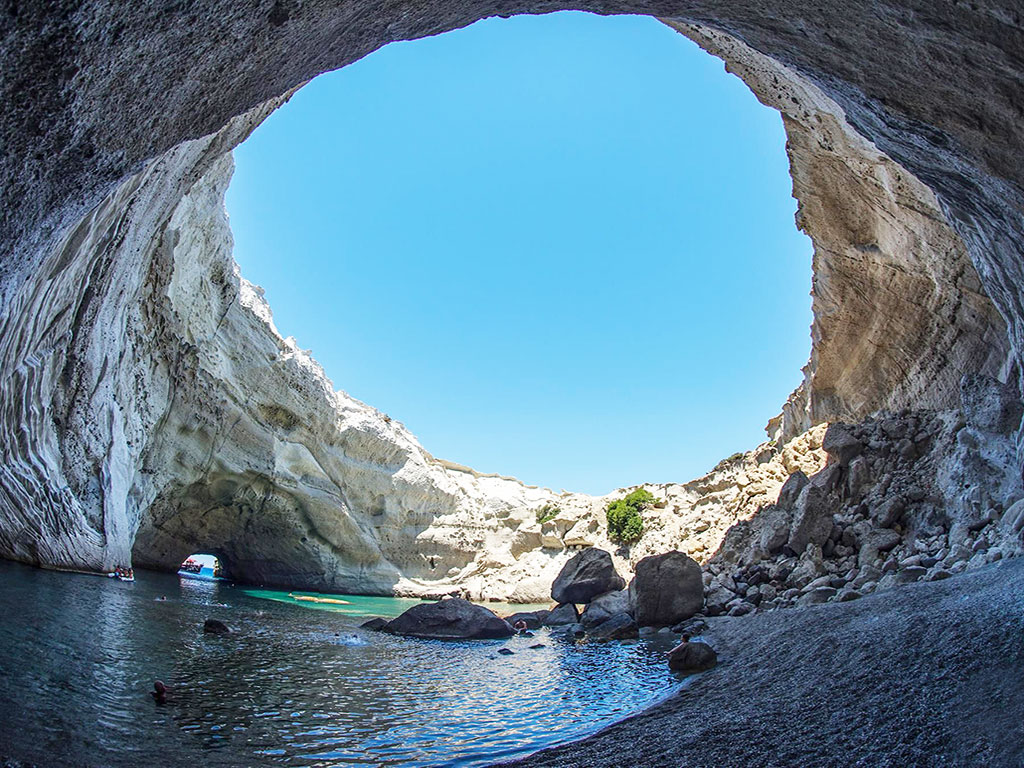 Leaving Kleftiko, we sail towards Sykia Cave, a hidden volcanic cave with a partially collapsed roof that creates a natural skylight over a protected indoor pool.